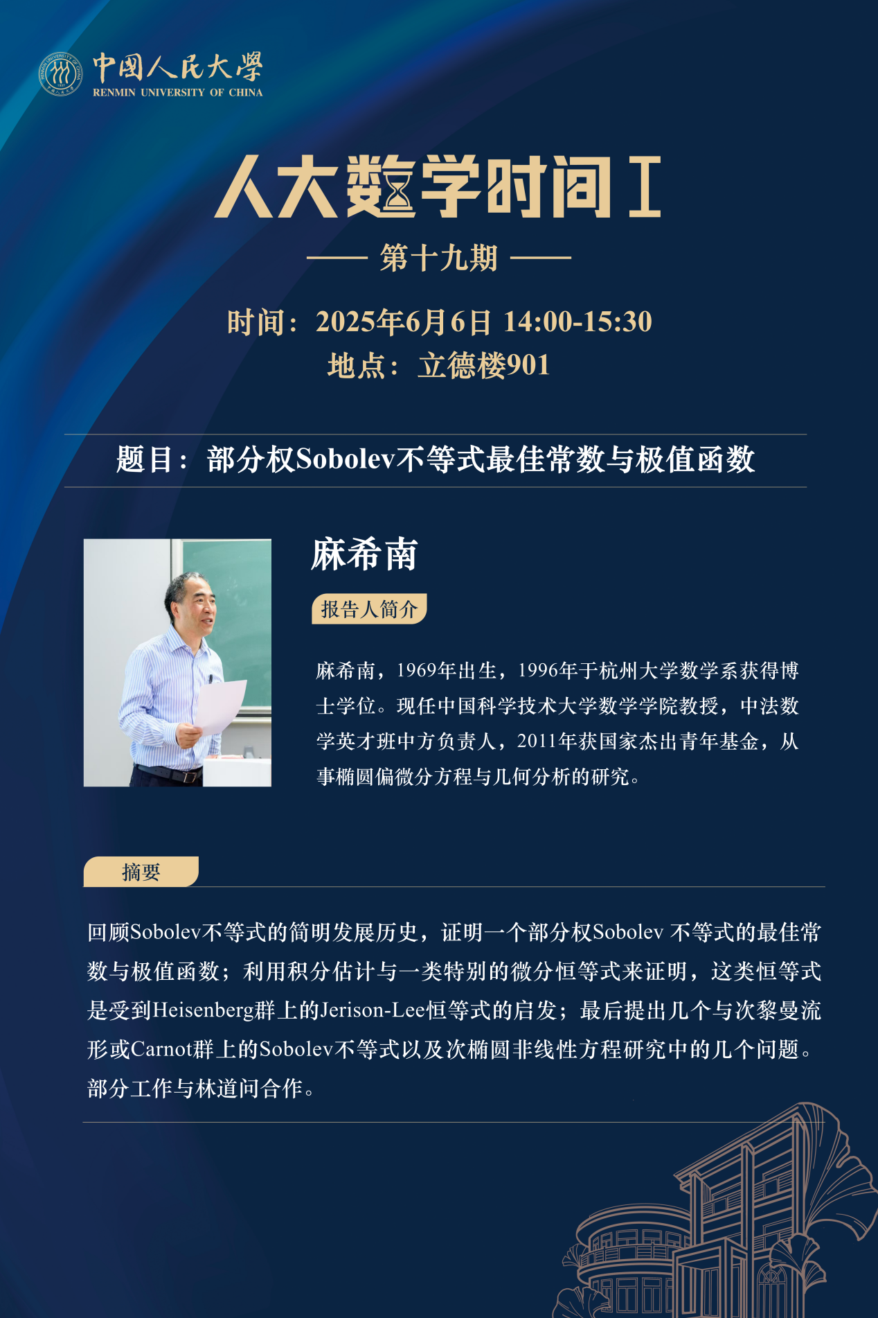 为促进学科交流融合、拓宽师生学术视野、释放科研创新活力,助力人大数学学科走向一流,吃瓜51 设立“人大数学时间”,以专题研讨、高端学术论坛为载体,搭建数学思想充分碰撞、优秀人才不断涌流、创造活力竞相迸发的舞台。“人大数学时间”将持之以恒,久久为功,立志通过交流与创新、提出重大问题,引领数学学科及相关领域的创新与发展,成为对我国数学发展有贡献意义的平台。以下为“人大数学时间I”第十九期信息: