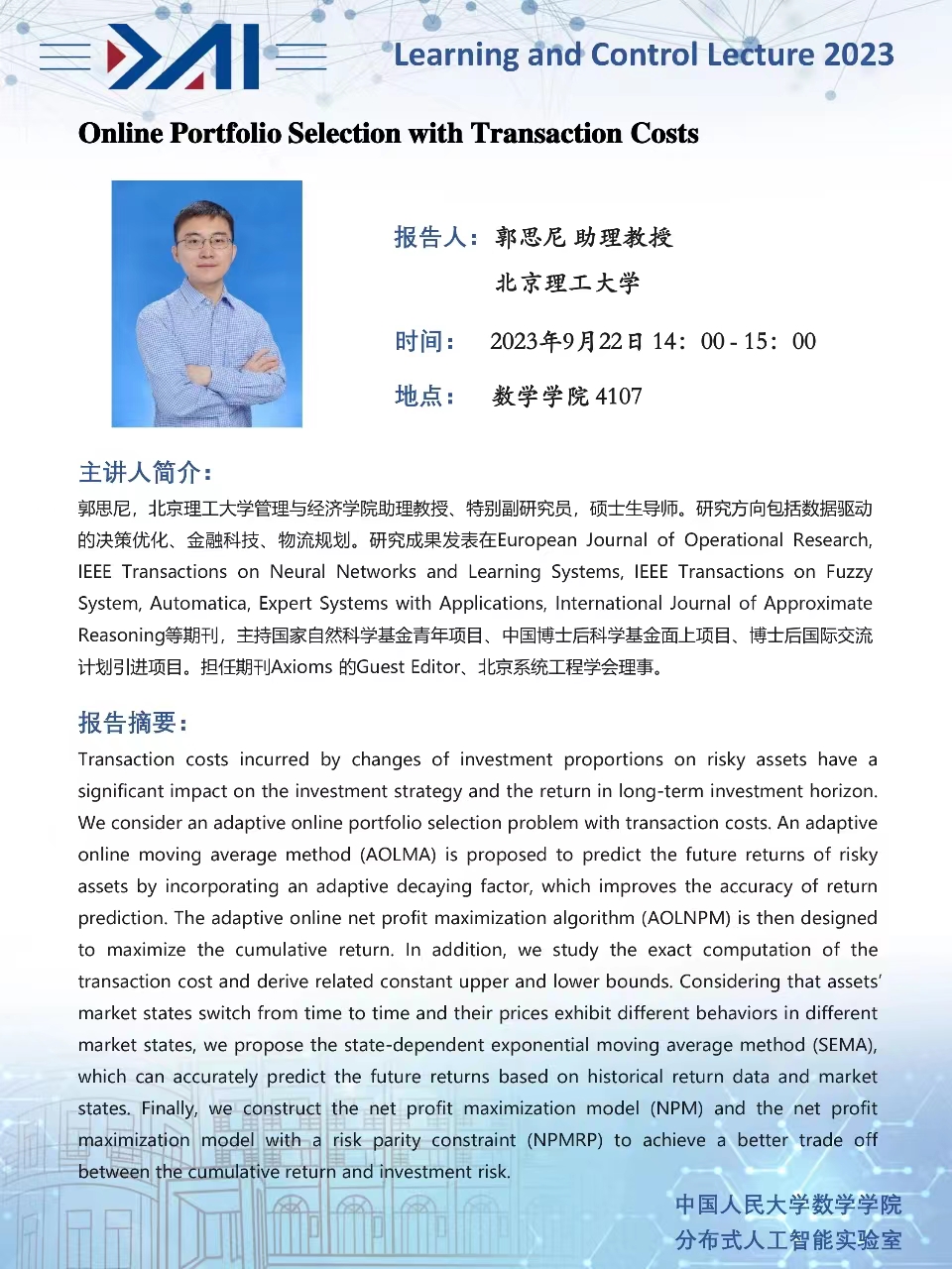 郭思尼,北京理工大学管理与经济学院助理教授、特别副研究员,硕士生导师。研究方向包括数据驱动的决策优化、金融科技、物流规划。研究成果发表在European Journal of Operational Research, IEEE Transactions on Neural Networks and Learning Systems, IEEE Transactions on Fuzzy System, Automatica, Expert Systems with Applications, International Journal of Approximate Reasoning等期刊,主持国家自然科学基金青年项目、中国博士后科学基金面上项目、博士后国际交流计划引进项目。担任期刊Axioms 的Guest Editor、北京系统工程学会理事。