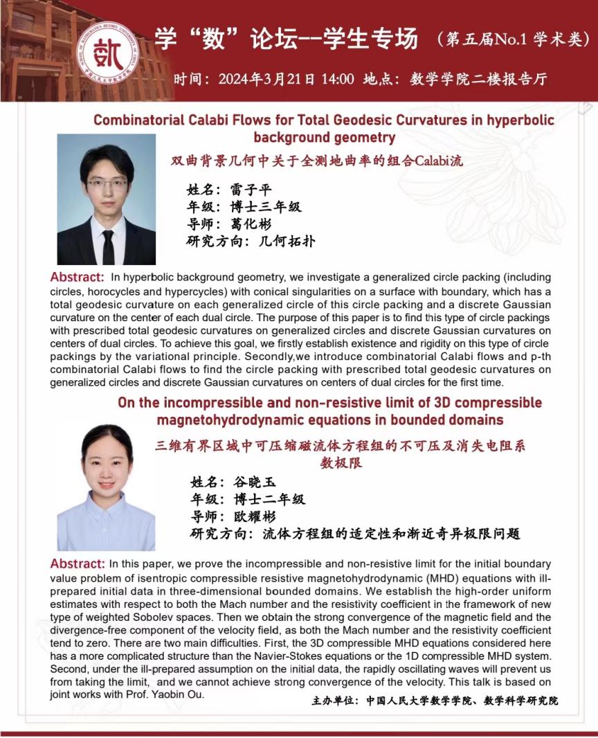 大家好,本届学“数”论坛——学生专场的第一场报告来啦!本场报告类型为学术类,将于2024年3月21日14:00在吃瓜51 二楼报告厅举办。主讲嘉宾为博士三年级雷子平同学、博士二年级谷晓玉同学。