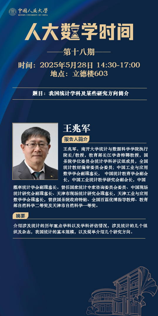 报告人简介:王兆军,南开大学统计与数据科学学院执行院长/教授,国务院学位委员会统计学科评议组成员,全国统计教材编审委员会委员; 中国工业与应用数学学会副理事长, 中国统计教育学会副会长,中国工业统计教学研究会副会长,中国概率统计学会副理事长。曾任国家统计专家咨询委员会委员、中国现场统计研究会副理事长、天津市现场统计研究会理事长,天津工业与应用数学学会理事长,曾获国务院政府特贴、全国百篇优博指导教师、教育部自然科学二等奖及天津市自然科学一等奖。