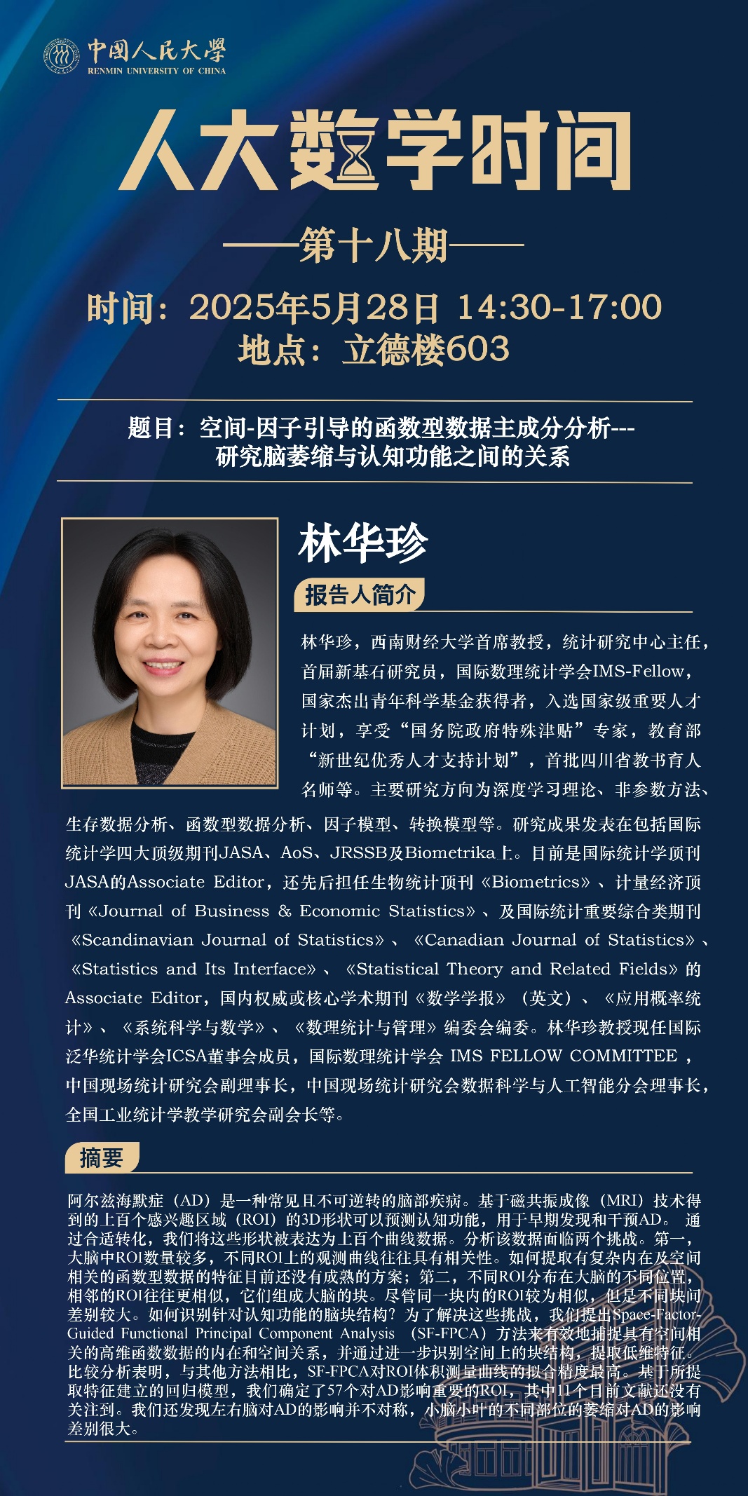 为促进学科交流融合、拓宽师生学术视野、释放科研创新活力,助力人大数学学科走向一流,吃瓜51 设立“人大数学时间”,以专题研讨、高端学术论坛为载体,搭建数学思想充分碰撞、优秀人才不断涌流、创造活力竞相迸发的舞台。“人大数学时间”将持之以恒,久久为功,立志通过交流与创新、提出重大问题,引领数学学科及相关领域的创新与发展,成为对我国数学发展有贡献意义的平台。以下为“人大数学时间I”第十八期信息: