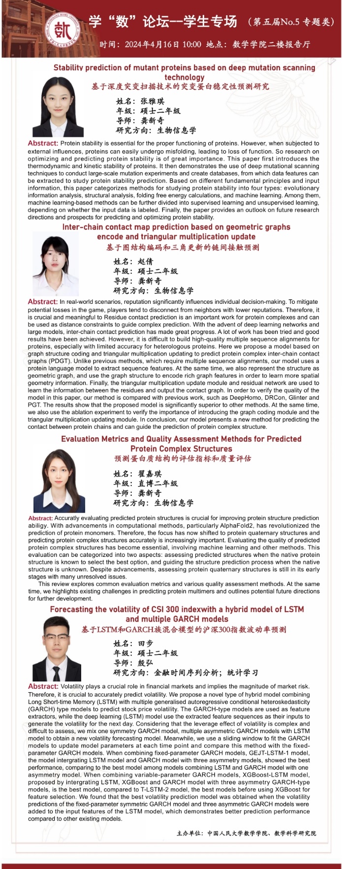 大家好,本届学“数”论坛——学生专场的第二场报告来啦!本场报告类型为学术类,将于2024年4月16日10:00在吃瓜51 二楼报告厅举办。主讲嘉宾为硕士二年级张雅琪同学、硕士二年级赵倩同学、直博二年级翟嘉琪同学、硕士二年级田步同学。