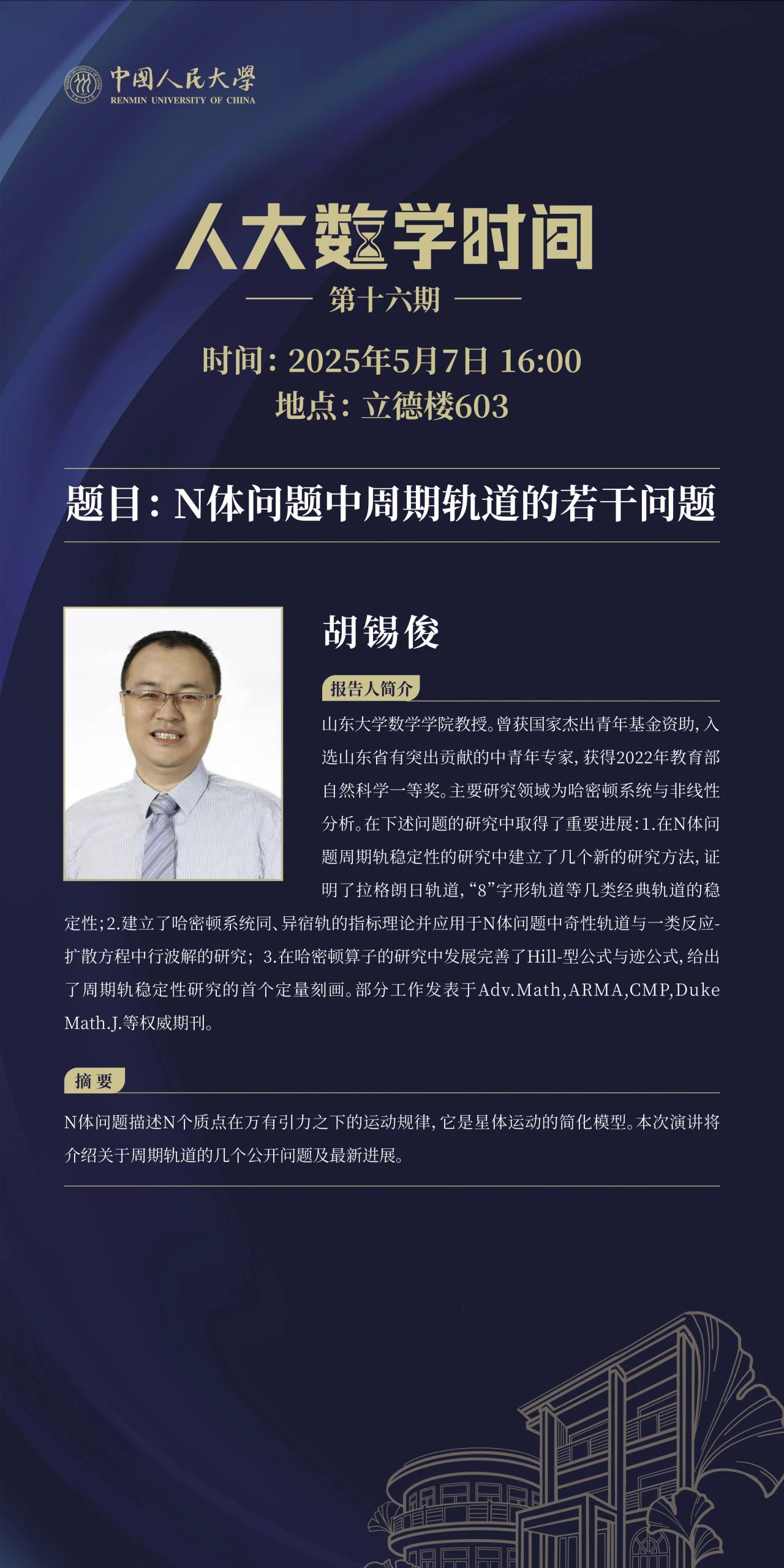 为促进学科交流融合、拓宽师生学术视野、释放科研创新活力,助力人大数学学科走向一流,吃瓜51 设立“人大数学时间”,以专题研讨、高端学术论坛为载体,搭建数学思想充分碰撞、优秀人才不断涌流、创造活力竞相迸发的舞台。“人大数学时间”将持之以恒,久久为功,立志通过交流与创新、提出重大问题,引领数学学科及相关领域的创新与发展,成为对我国数学发展有贡献意义的平台。以下为“人大数学时间I”第十六期信息: