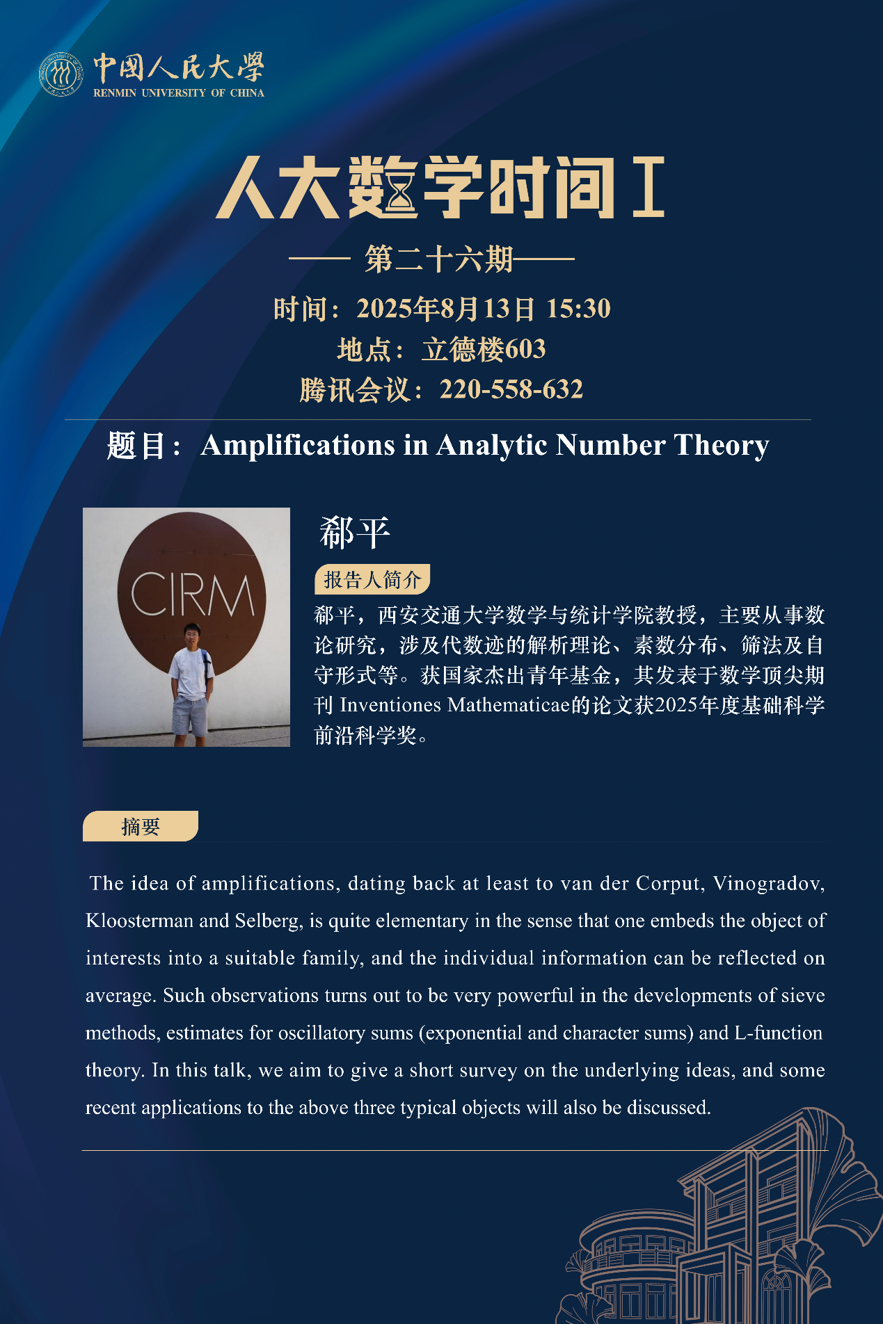 报告人简介:郗平,西安交通大学数学与统计学院教授,主要从事数论研究,涉及代数迹的解析理论、素数分布、筛法及自守形式等。获国家杰出青年基金,其发表于数学顶尖期刊 Inventiones Mathematicae的论文获2025年度基础科学前沿科学奖。