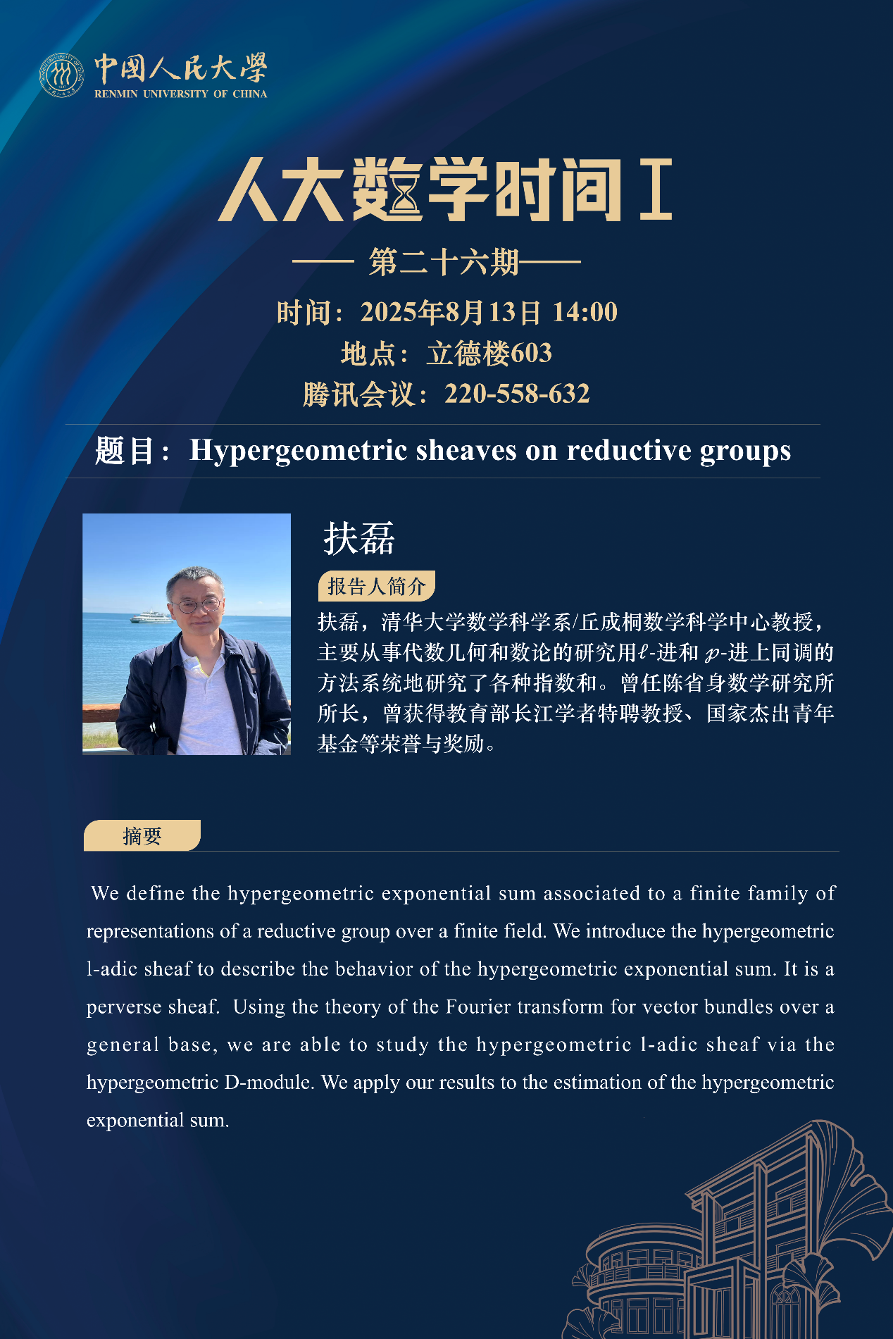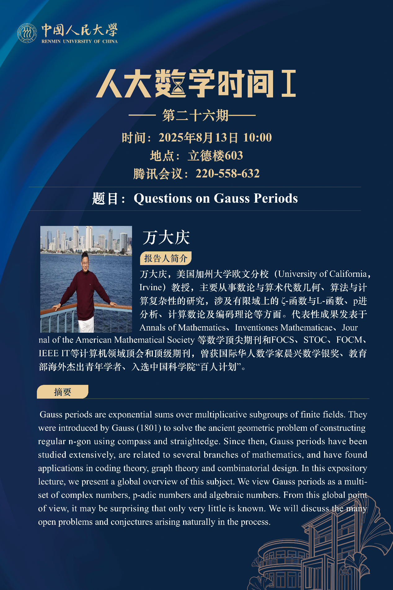 为促进学科交流融合、拓宽师生学术视野、释放科研创新活力,助力人大数学学科走向一流,吃瓜51 设立“人大数学时间”,以专题研讨、高端学术论坛为载体,搭建数学思想充分碰撞、优秀人才不断涌流、创造活力竞相迸发的舞台。“人大数学时间”将持之以恒,久久为功,立志通过交流与创新、提出重大问题,引领数学学科及相关领域的创新与发展,成为对我国数学发展有贡献意义的平台。以下为“人大数学时间I”第二十六期信息: