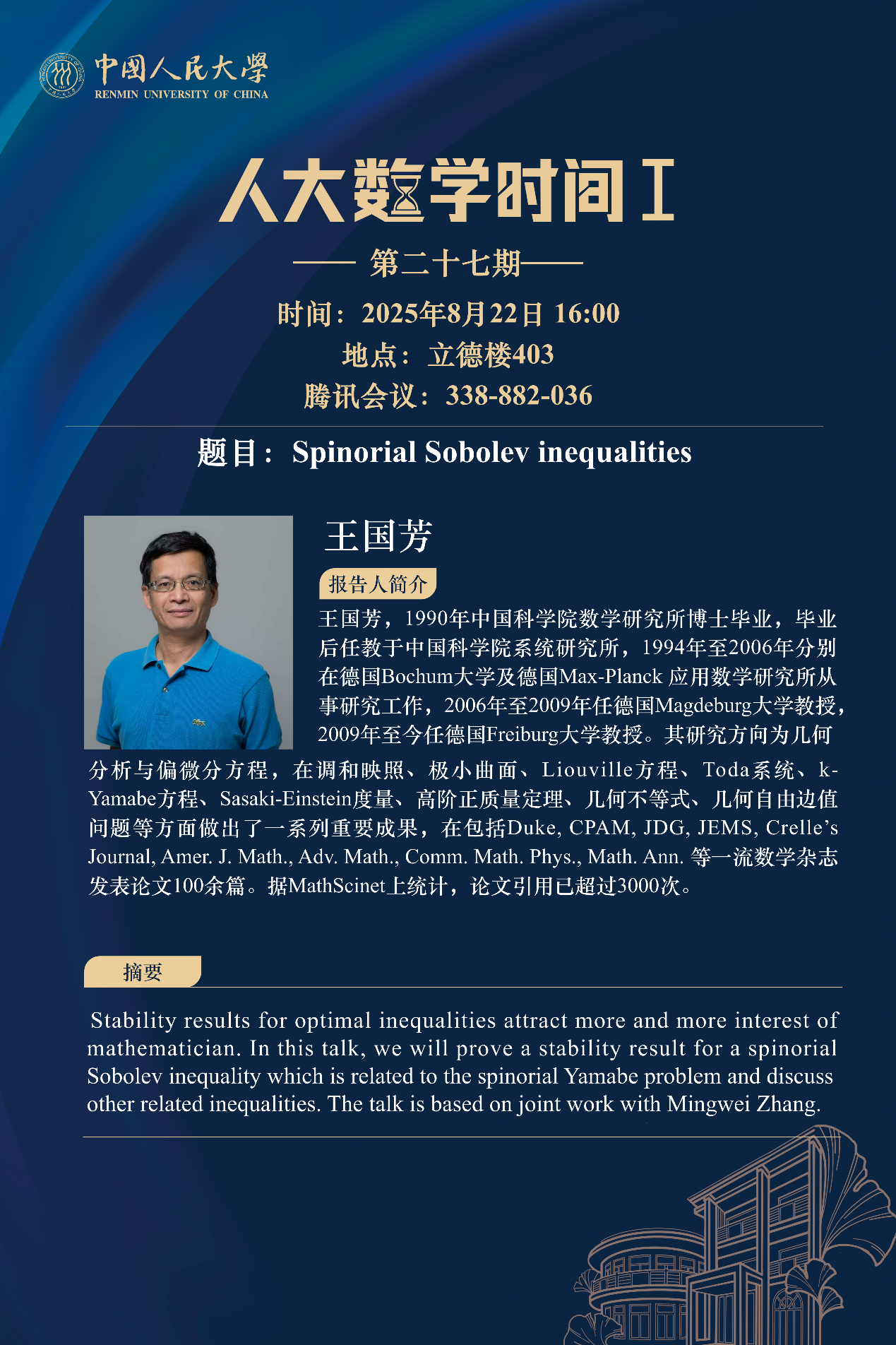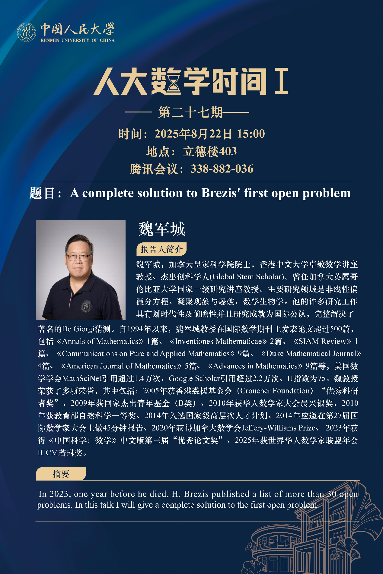 为促进学科交流融合、拓宽师生学术视野、释放科研创新活力,助力人大数学学科走向一流,吃瓜51 设立“人大数学时间”,以专题研讨、高端学术论坛为载体,搭建数学思想充分碰撞、优秀人才不断涌流、创造活力竞相迸发的舞台。“人大数学时间”将持之以恒,久久为功,立志通过交流与创新、提出重大问题,引领数学学科及相关领域的创新与发展,成为对我国数学发展有贡献意义的平台。以下为“人大数学时间I”第二十七期信息: