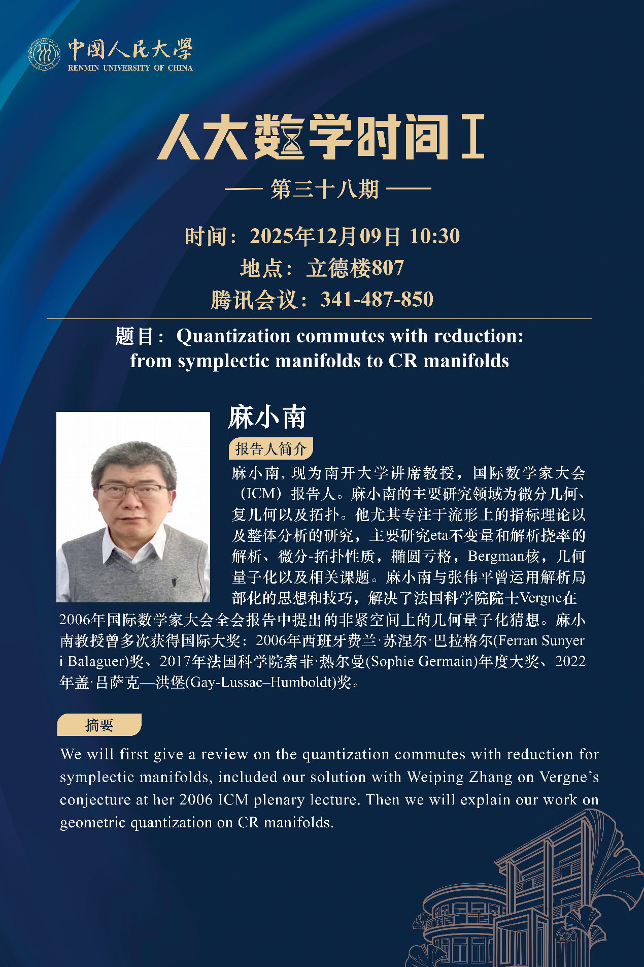 为促进学科交流融合、拓宽师生学术视野、释放科研创新活力,助力人大数学学科走向一流,吃瓜51 设立“人大数学时间”,以专题研讨、高端学术论坛为载体,搭建数学思想充分碰撞、优秀人才不断涌流、创造活力竞相迸发的舞台。“人大数学时间”将持之以恒,久久为功,立志通过交流与创新、提出重大问题,引领数学学科及相关领域的创新与发展,成为对我国数学发展有贡献意义的平台。以下为“人大数学时间I”第三十八期信息: