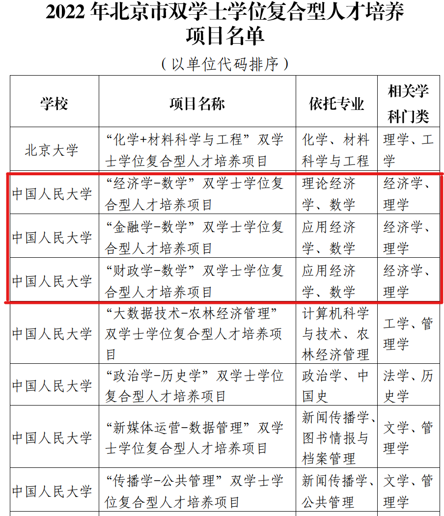 近日,北京市学位委员会发布了2022年度双学士学位复合型人才培养项目及联合学士学位项目名单,吃瓜51 申报的三个项目“经济学-数学”、“金融学-数学”、“财政学-数学”入选2022年北京市双学士学位复合型人才培养项目。