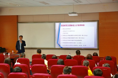 接下来,研究生院培养管理办公室王强老师介绍了我校研究生国际化人才培养体系,留学基金委项目的历年申请和校内推选工作的基本情况,并对年度校内选拔流程工作的具体流程和细节要求做了说明。并就材料准备中重点注意事项做了详细解读。