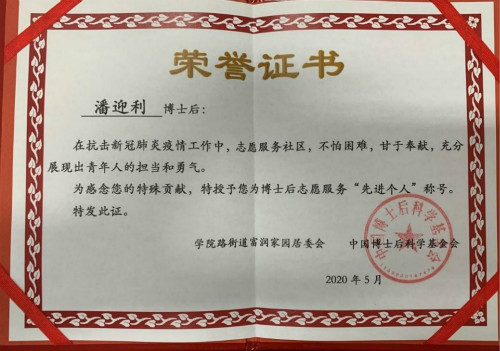 近日,数学科学研究院师资博士后潘迎利被富润家园居委会、中国博士后科学基金会授予博士后志愿服务“先进个人”称号。