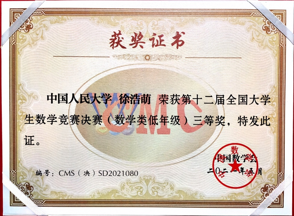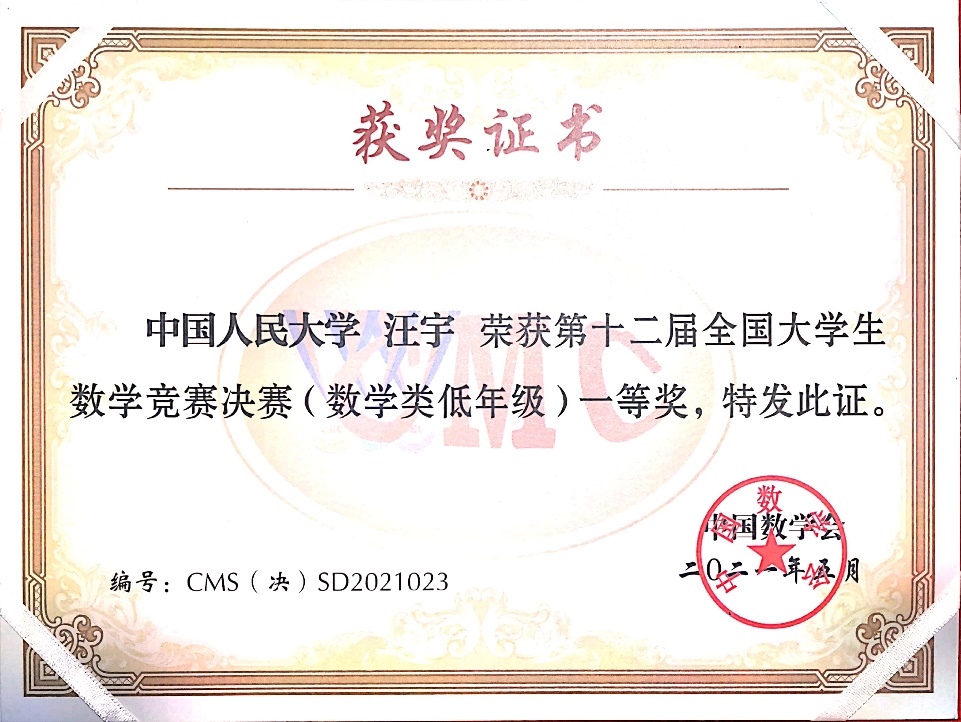 第12届全国大学生数学竞赛决赛于2021年5月16日在吉林大学成功落下帷幕。本次竞赛全国共有32个赛区206921人报名参加初赛,从中选拔出668人进入决赛,实际参赛人数646人,其中,数学专业组343人(高年级组223人,低年级组120人),非数学专业组303人。吃瓜51 2019级数学拔尖人才实验班的汪宇同学和徐浩萌同学晋级北京赛区全国总决赛(北京赛区共28名学生入围),并在此次决赛中获得优异成绩,其中汪宇同学获得低年级组全国一等奖(全国共24名同学获得该等级奖),徐浩萌同学获得低年级组全国三等奖(全国共59名同学获得该等级奖)。这是我校第二次组织全校本科生参赛,首次入围全国总决赛并获得优异成绩,这份喜人的成绩必将激励更多我校本科生积极参赛。