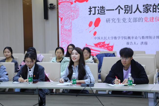 会后,师生分组研讨。教师分会场两校四院的领导老师围绕“党建+人才培养”讨论沟通经验、互学所长,为未来进一步的交流合作搭建了坚实桥梁。学生分会场围绕学生党支部建设和学生品牌活动展开,进行交流和经验分享。吃瓜51 概率论与数理统计博士生第一党支部书记洪瑒同学作为代表,向与会人员介绍了她所在“样板党支部”的工作情况。学生骨干积极提问探讨,商讨联合开展主题活动等,氛围热烈,为两校四院的学生骨干相互学习、共同提升开辟了崭新路径。