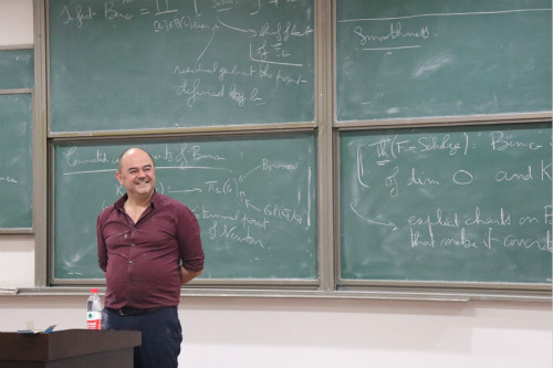 在他和法国科学院院士Fontaine教授的合作中,他们定义并且研究了一条p进Hodge理论的基本曲线,即Fargues-Fontaine曲线。在这条曲线出现之前,实现p进Langlands纲领的几何化是极为困难的,而Fargues-Fontaine曲线就是一个p进Langlands纲领几何化实现的一个强有力工具。在报告中他解释了如何用该曲线上G-bundles来构造一个stack “Bun_G”,及其与G-Isocrystals的关系。这个stack的光滑性结果是他和2018年菲尔兹奖得主P.Scholze的最新研究。