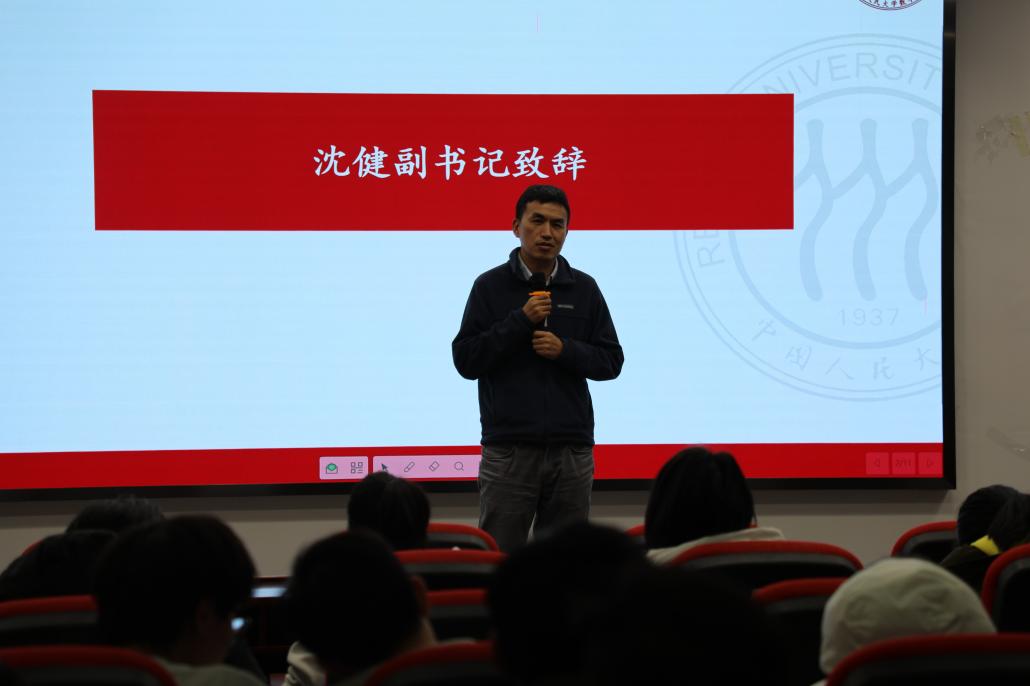 大会在庄严的国歌声中隆重开始,党委副书记沈健老师致辞。他充分肯定了本次共青团吃瓜51 第二次代表大会召开的意义,强调坚持“以党建带团建”的工作思路,勉励广大团员代表坚定听党话、跟党走的政治信念,提高身份意识,在思想、工作及生活中发挥先锋模范作用。沈健老师代表学院向大会筹备工作组成员以及全体参会代表表示衷心感谢,并预祝本次团员代表大会召开及新一届团委委员选举工作取得圆满成功。