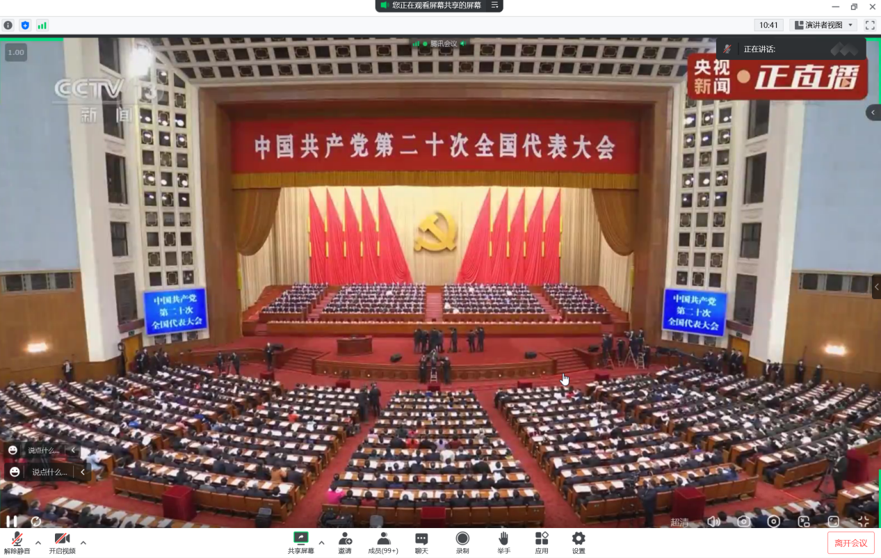 随着中国共产党第二十次全国代表大会开幕,线下会场同志们全体起立,高唱国歌,并为已故老一辈无产阶级革命家和革命先烈默哀。全体师生仔细聆听习近平总书记代表十九届中央委员会向大会作报告,报告高瞻远瞩、振奋人心,提出了一系列重要思想、重要观点、重大判断、重大举措,展示了党和国家未来发展的美好前景。大家聚精会神,认真聆听,不时报以热烈掌声。