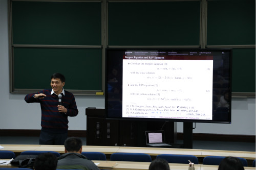 冯兆生教授首先从方程的背景和创始人讲起,深入浅出地介绍了Burgers方程、KdV方程和KdV-Burgers方程的产生、组合以及最近得到的新解,借这些方程及其行波解引出KdV-Burgers-Kuramoto方程的发展历程和相关研究动态。然后,通过“利用镜子可以看到背后的事物” 形象地引出Lie对称思想,并介绍了用Lie对称理论的处理手法将偏微分方程转化常微分方程,通过分析技巧得到了所研究模型的显示或隐式解。报告过程中,冯教授还穿插了挪威数学家马里乌斯·索菲斯·李(Marius Sophus Lie)、法国数学家亨利·庞加莱 (Jules Henri Poincaré)的一些轶闻趣事,结合自己的求学和工作经历,与大家一起分享了梦想、目标、坚持的魅力。