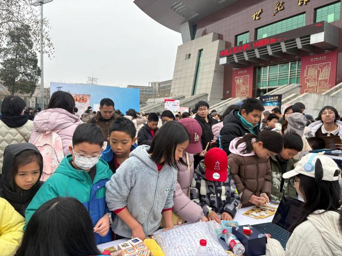 当日上午,世纪馆北广场人声鼎沸、暖意融融,数学游园会在此精彩启幕。活动以“π的奇幻之旅”为整体叙事框架,精心设计了五大主题关卡,沿着人类数学发展的认知路径铺展,从度量与计数,到符号与抽象,再到无穷、结构与随机,34个生动的数学故事串联其中,让参与者仿佛置身一场“数学文明的探险”。
