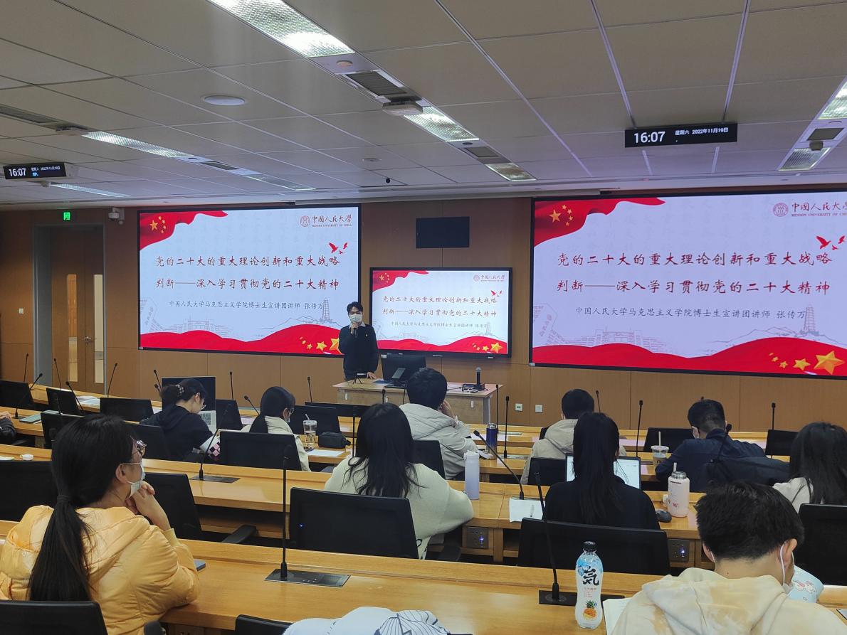 活动伊始,李仕琳介绍了本次党课活动的主要内容和主讲嘉宾。随后,张传万以《党的二十大的重大理论创新和重大战略判断——深入学习贯彻党的二十大精神》为题进行宣讲活动。首先,他对党的二十大的主题和重要历史意义进行了阐释。然后,他带领支部成员一起梳理了党的二十大报告的总体结构和主要内容。接着,他重点对党的二十大报告提出的“三个务必”“三件大事”“归根到底是两个行”“六个必须坚持”“一个中心任务”“中国式现代化的本质要求”“五项重大原则”等一系列新观点、新论断、新思想进行了讲解,对党的二十大作出的一系列重大战略判断进行了分析。最后,他指出学习宣传贯彻党的二十大精神要坚持正确的方法论,应努力做到学思用贯通、知信行统一。