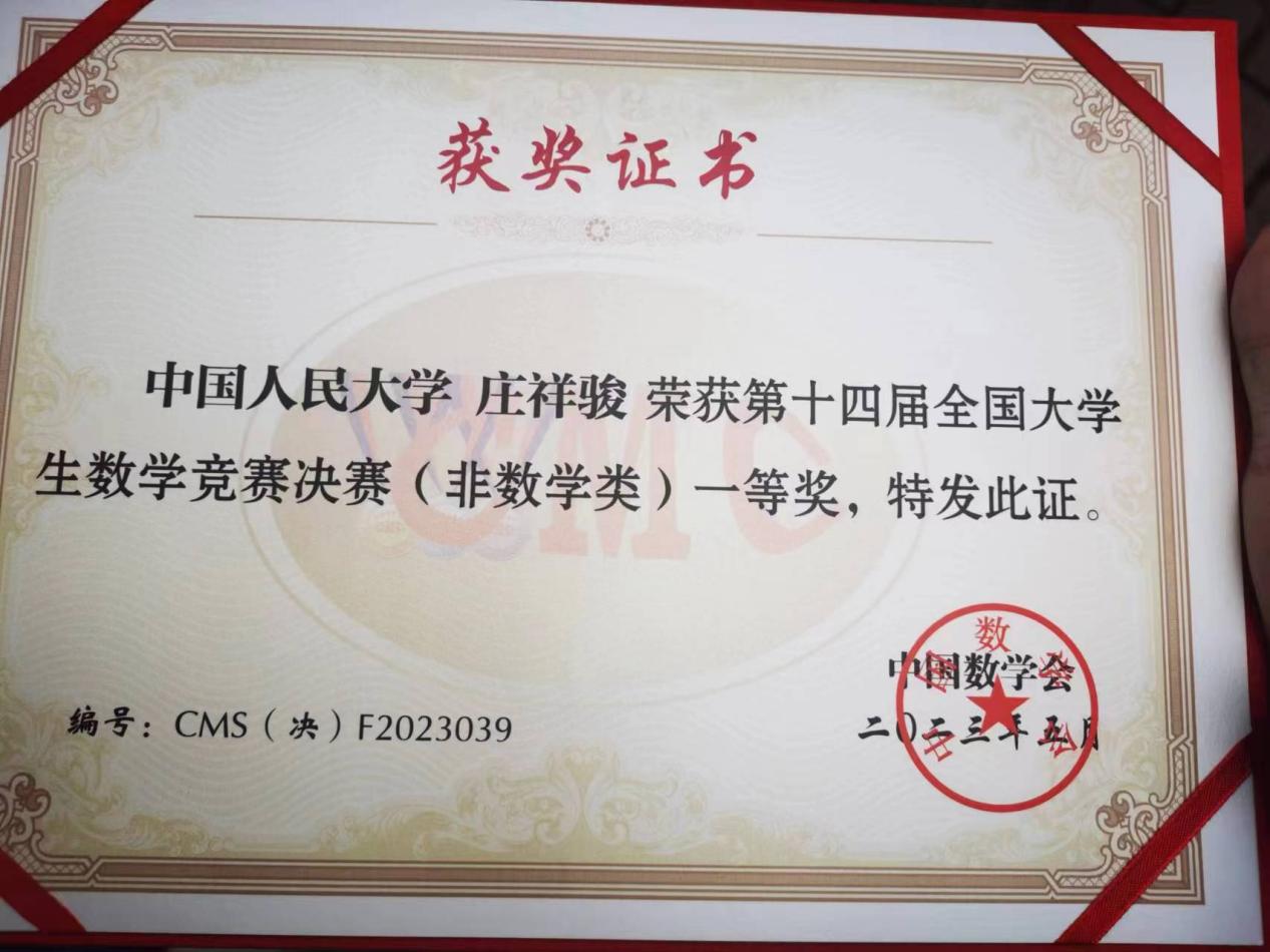统计学院2020级本科生庄祥骏同学晋级非数学类全国决赛,并在此次决赛中获得非数学类全国一等奖(全国共96名同学获得该等级奖)。我校学子继在上届大学生数学竞赛决赛中取得非数学类一等奖后再创辉煌,在此祝贺庄祥骏同学取得佳绩!