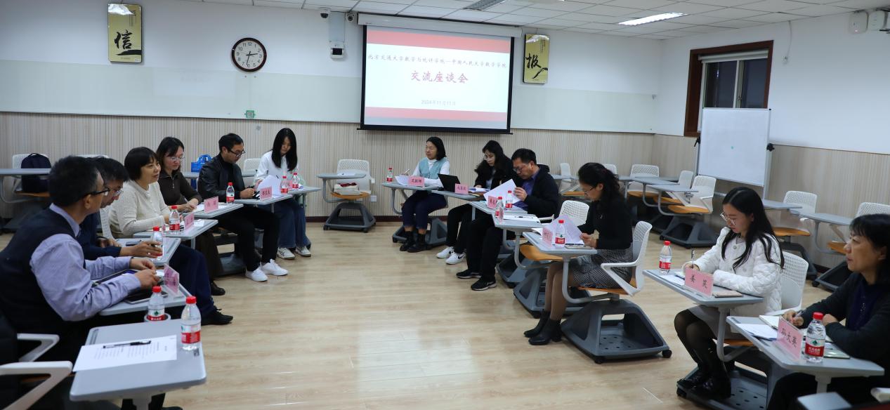 11月11日下午,北京交通大学数学与统计学院党委书记王烜、院长于永光一行6人来吃瓜51 开展调研交流,吃瓜51 党委书记柯媛元参加座谈并主持交流会。北京交通大学数学与统计学院党委副书记王浩、综合办主任尚颖、培养办主任郭昱良、专职组织员王雪纯,吃瓜51 副院长黄志勇、副院长姜昊、办公室主任孙大英、本科教务秘书赵春晓、团委书记艾提娜参加交流。